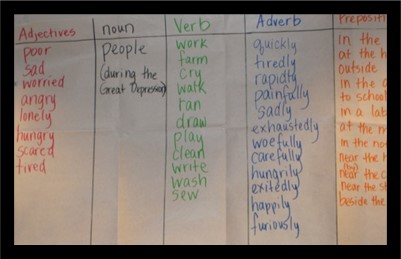 The SPC is often referred to as the “blue ribbon strategy” in Project GLAD because it is so useful and versatile. From the beginning of an instructional unit, teachers work with students to create a “language functional environment”, a classroom space where the walls are dripping with academic content and language. The walls are filled with comprehensible input constructed with the students including observation charts, inquiry charts, pictorial input charts, narrative inputs, chants, mind maps, all fully processed and made comprehensible with sketches, picture file cards, and realia that make the input comprehensible. In this environment, the teacher places a large sheet of chart paper in front of the class with five color-coded columns: adjective, noun, verb, adverb, prepositional phrase. The teacher provides one concrete noun, and the students talk with their partners to brainstorm parts of speech that support that noun. Students use the resources in the room and their own background knowledge to list each part of speech. Students then practice building sentences by chanting sentences to the song Farmer in the Dell. On another day the teacher plays the “Reading and Trading Game”. The teacher rewrites the parts of speech on sentence strips and hands them out to groups randomly. Students must negotiate with other groups to find all the parts of speech to make a meaningful sentence. The SPC can be added to later on, and as an extension, students can create their own SPC in teams and as individuals. The SPC is later used to help students embellish their writing.